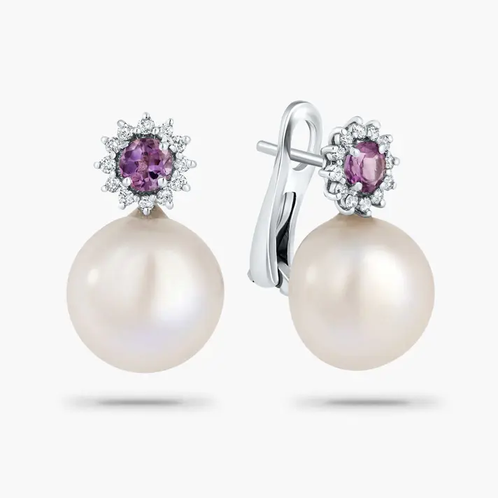 עגילי זהב 14K מקולקציית אוצרות הטבע שכולה יצירה של הטבע עם שיבוץ אבני חן מסוג אמטיסט, 24 יהלומים טבעיים ונוצצים ופנינים טבעיות שגדלו במים מתוקים.