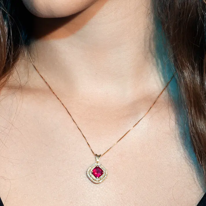 תליון זהב צהוב 14K משובץ באבן רובי גלס מוקפת ב 56 יהלומים. רוחב וגובה התליון 1.4 ס"מ, רוחב וגובה אבן הרובי גלס 0.7 ס"מ