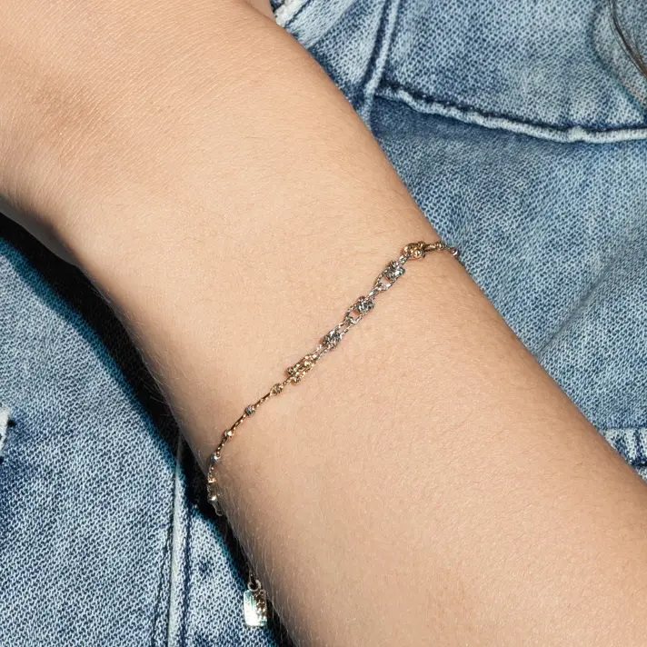 צמיד ריו עשוי זהב 14K בשילוב חוליות בגווני צהוב ולבן, כדורי זהב בקוטר 1 מ"מ ובגימור לייזר מנצנץ. הצמיד הינו חלק מקולקציית ה- GOLDEN GLOW החדשה השומרת על קווים קלאסיים ובעיצוב עכשווי. אורך הצמיד 17 ס"מ + 2.5 ס"מ נוספים.