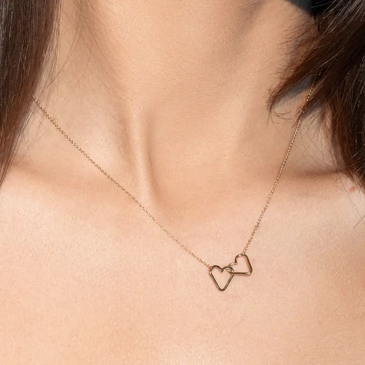 שרשרת זהב עם חיבור שני תליוני לב אחד לשני. מידות הלבבות 0.9*0.9 ס"מ. מידות השרשרת 42 ס"ממ+ 2.5 ס"מ הארכה נוספים.