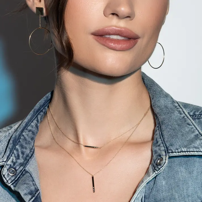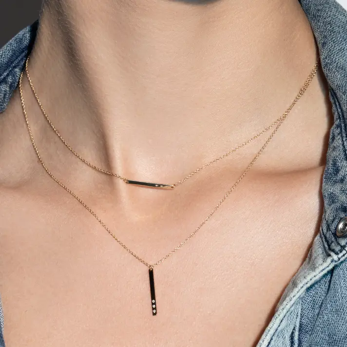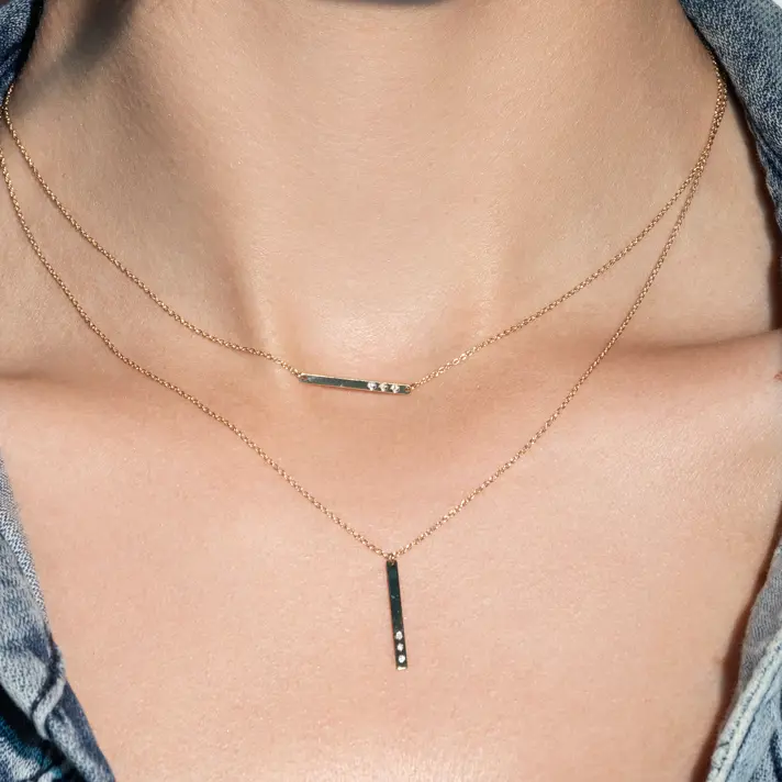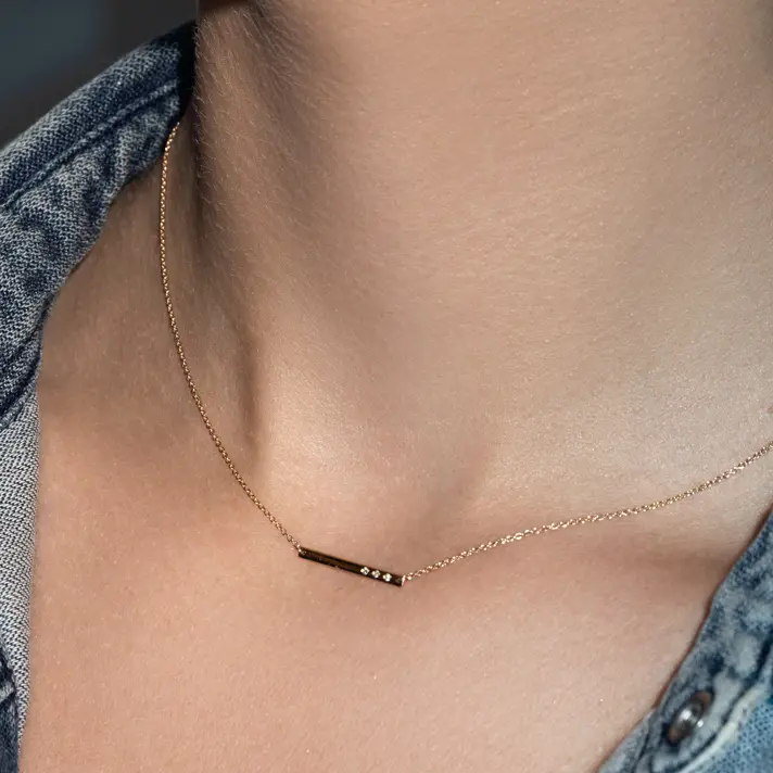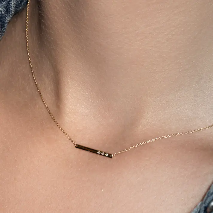 שרשרת זהב 14K עם תליון פס רוחבי במידות 20*1.5 מ"מ, המשובץ 3 יהלומים טבעיים ונוצצים. מידות השרשרת 42 ס"מ+ 2.5 ס"מ הארכה נוספים.