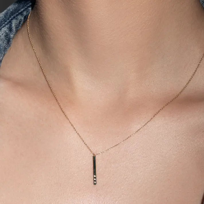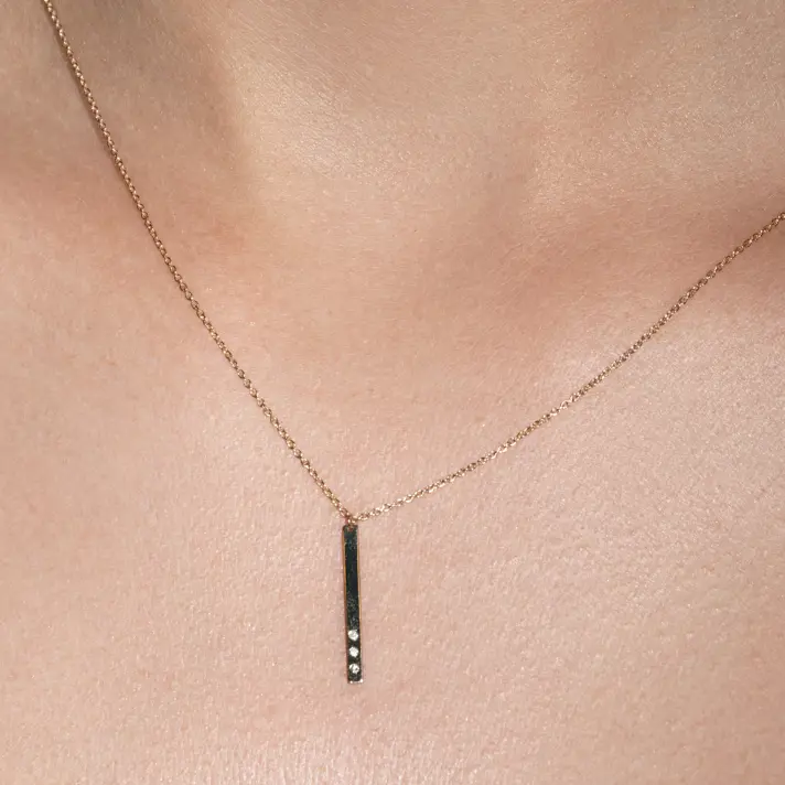 שרשרת זהב 14K עם תליון פס אורכי באורך 2 ס"מ המשובץ 3 יהלומים טבעיים ונוצצים. מידות השרשרת 42 ס"מ+ 2.5 ס"מ הארכה נוספים.