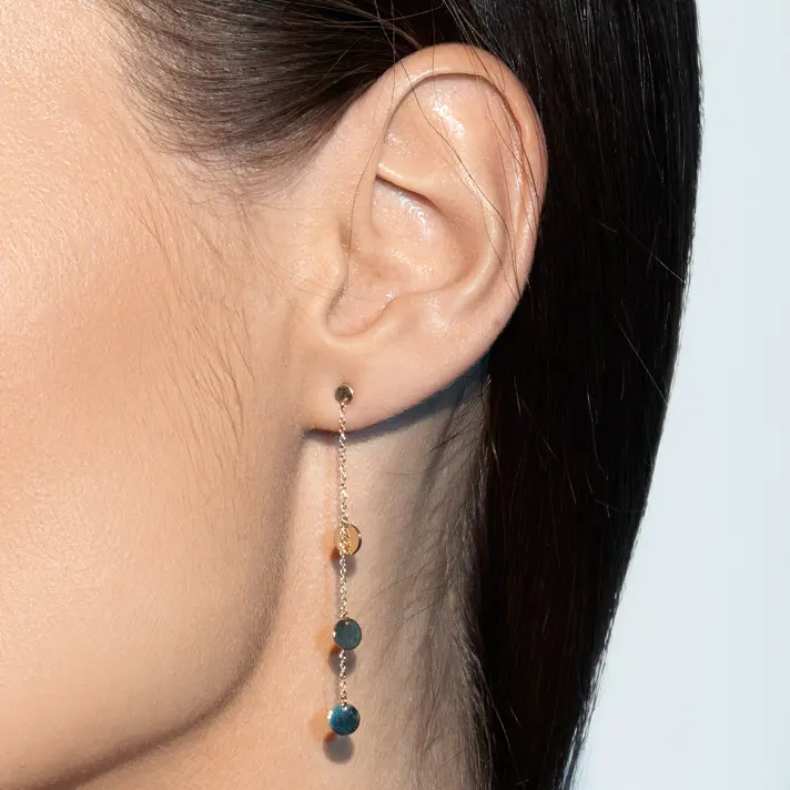 עגילי זהב 14K ארוכים בשילוב דיסקיות זהב. אורך העגילים 5.6 ס"מ, קוטר הדיסקיות 5 מ"מ.