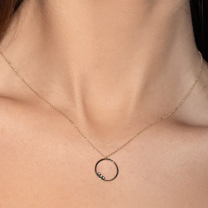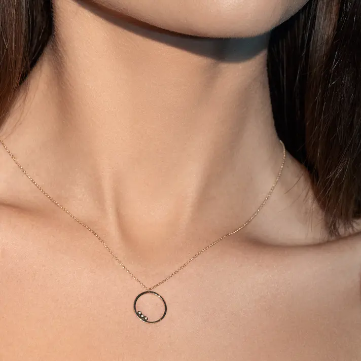 שרשרת זהב 14K עם תליון עגול המשובץ 3 זרקונים נוצצים. אורך השרשרת 42 ס"מ + 2.5 ס"מ נוספים, קוטר התלין 1.5 ס"מ.
