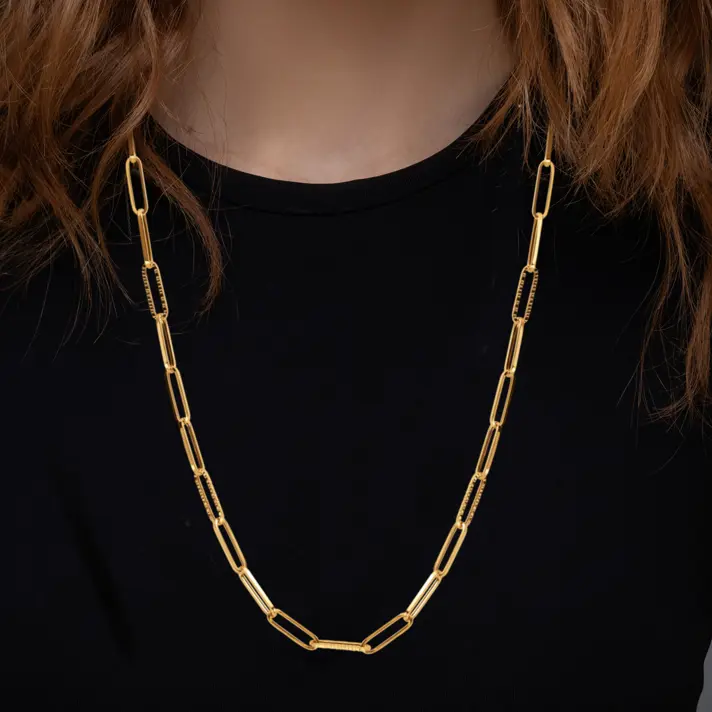 שרשרת זהב 14K עשויה מחוליות באורך 1.5 *0.5 ס"מ עם גימור חלק או לייזר לאקסטרא נצנוץ. אורך השרשרת 43 ס"מ.