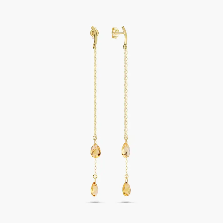 עגילי זהב 14K ארוכים עם טיפות סיטרין. אורך העגילים 8 ס"מ.