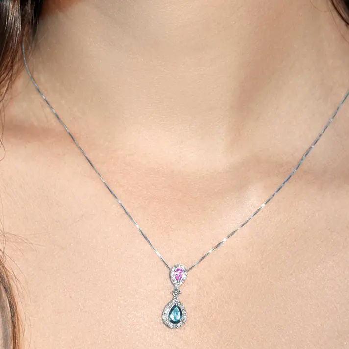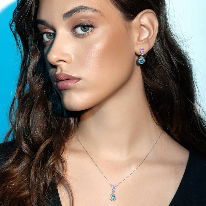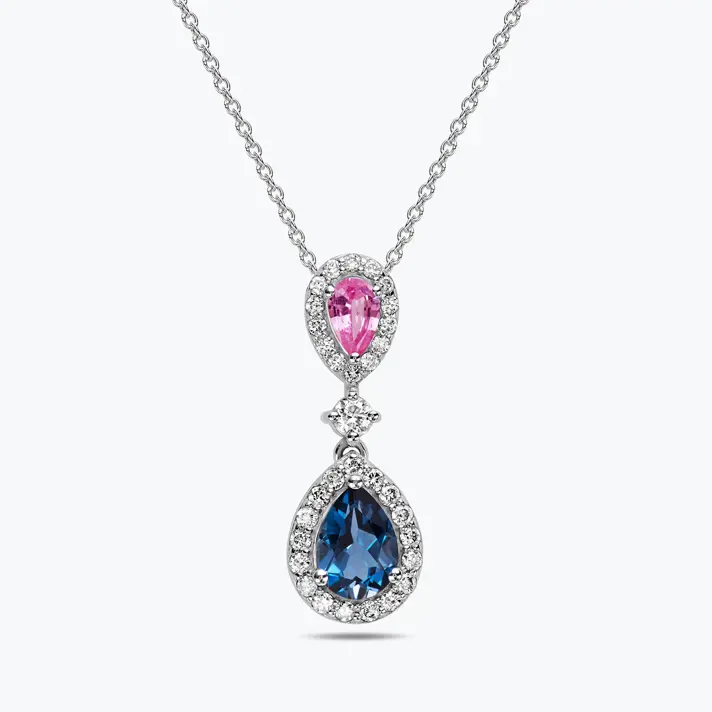 תליון זהב 14K המעוצב עם שתי אבני חן מסוג בלו לונדון ואבני ספיר ורודות בחיתוך טיפה יוקרתי המוקפות 32 יהלומים טבעיים ונוצצים. אורך התליון 2 ס"מ ורוחבו 0.8 ס"מ.