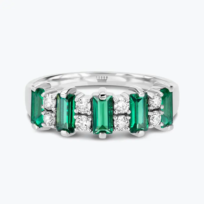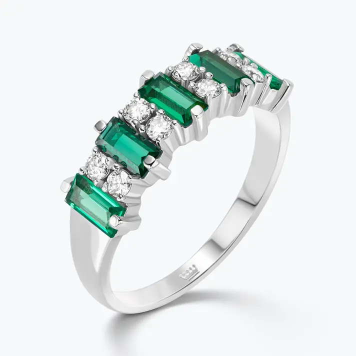 טבעת זהב בשיבוץ 5 אבני גרין גראנט ו 8 יהלומים טבעיים ונוצצים בחיתוך עגול. רוחב הטבעת 5 מ"מ.