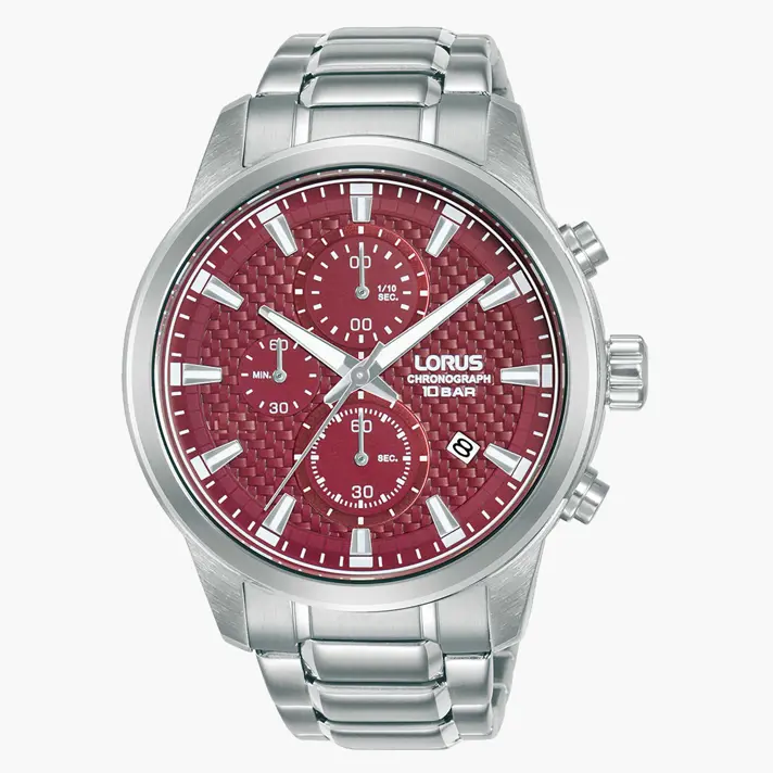 שעון LORUS מבית SEIKO יפן בעל לוח אדום עם טקסטורת אריגה, תאריכון ושעון סטופר. לשעון צמיד מתכת איכותי וזכוכית קריסטל. השעון עמיד למים לעומק 100 מטר וקוטרו 43 מ"מ.