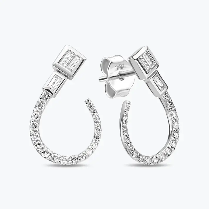 עגילי בלייקלי מזהב 14K בצורת חצי טיפה המשובצים 44 יהלומים טבעיים ונוצצים מתוכם 6 בשיבוץ באגט היוקרתי. מידות העגילים קוטר 1.0 ס"מ,4*3 מ"מ מידת חלק עליון.