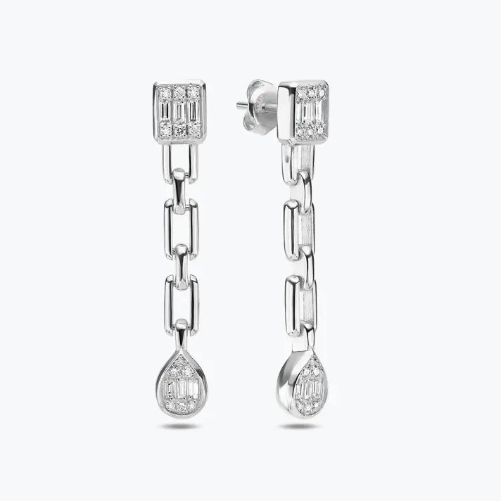 עגילי גלאמי ארוכים מזהב 14K בשיבוץ יהלומים ובשילוב חוליות המחזיקות טיפה. בעגילים משובצים 36 יהלומים טבעיים ונוצצים מתוכם 12 בשיבוץ באגט היוקרתי. מידות: אורך 3.6 ס"מ,טיפה וחלק עליון 0.5*0.6 ס"מ,