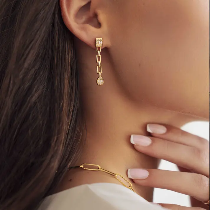 עגילי גלאמי ארוכים מזהב 14K בשיבוץ יהלומים ובשילוב חוליות המחזיקות טיפה. בעגילים משובצים 36 יהלומים טבעיים ונוצצים מתוכם 12 בשיבוץ באגט היוקרתי. מידות: אורך 3.6 ס"מ,טיפה וחלק עליון 0.5*0.6 ס"מ,