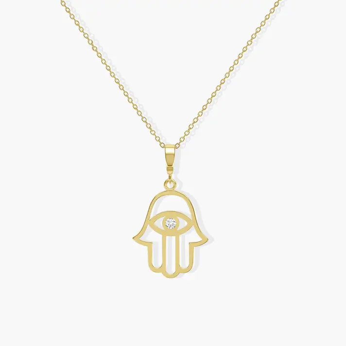 תליון זהב 14K חמסה בשילוב עין לשמירה מאנרגיות רעות. התליון משובץ זרקונים נוצצים. מידות התליון 1.5*1.3 ס"מ.