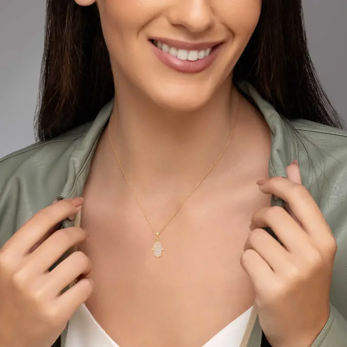 תליון חמסה מזהב 14K בשיבוץ זרקונים נוצצים. מידות התליון 1.2*1.0 ס"מ