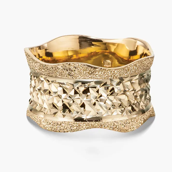 טבעת נישואין רחבה בעלת עיטורים שונים בזהב צהוב. ניתן להשיג את הטבעת בכל שילוב צבע זהב,גודל ורוחב.