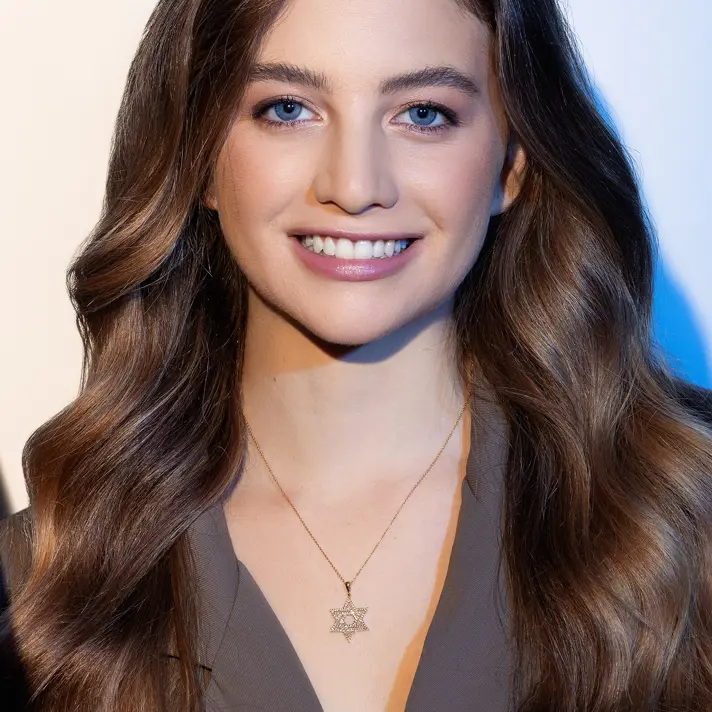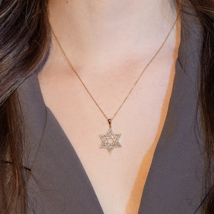 תליון מגן דוד כפול מזהב 14K בשיבוץ 108 יהלומים טבעיים ונוצצים. מידות התליון 2.0*1.7 ס"מ.