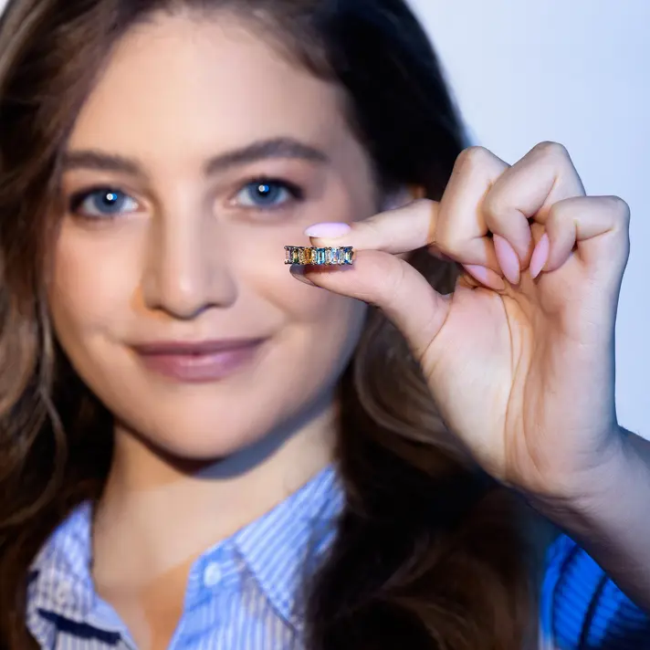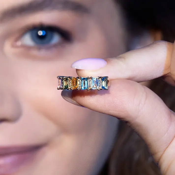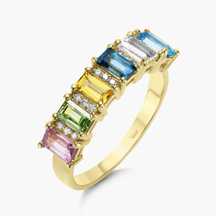 טבעת מקולקציית ה RAINBOW מזהב 14K בשיבוץ 7 ספירים ו 12 יהלומים טבעיים ונוצצים