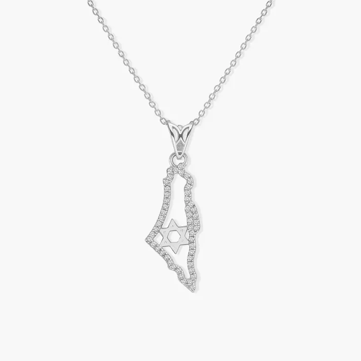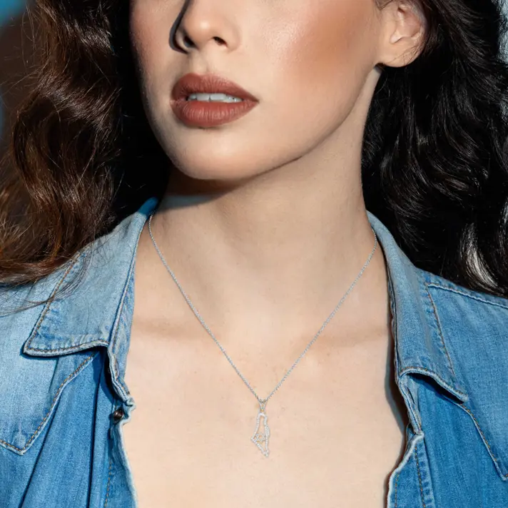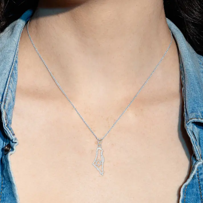 תליון ארצנו מזהב 14K בצורת ארץ ישראל כשבמרכזה מגן דוד. בתליון משובצים 49 יהלומים טבעיים ונוצצים.