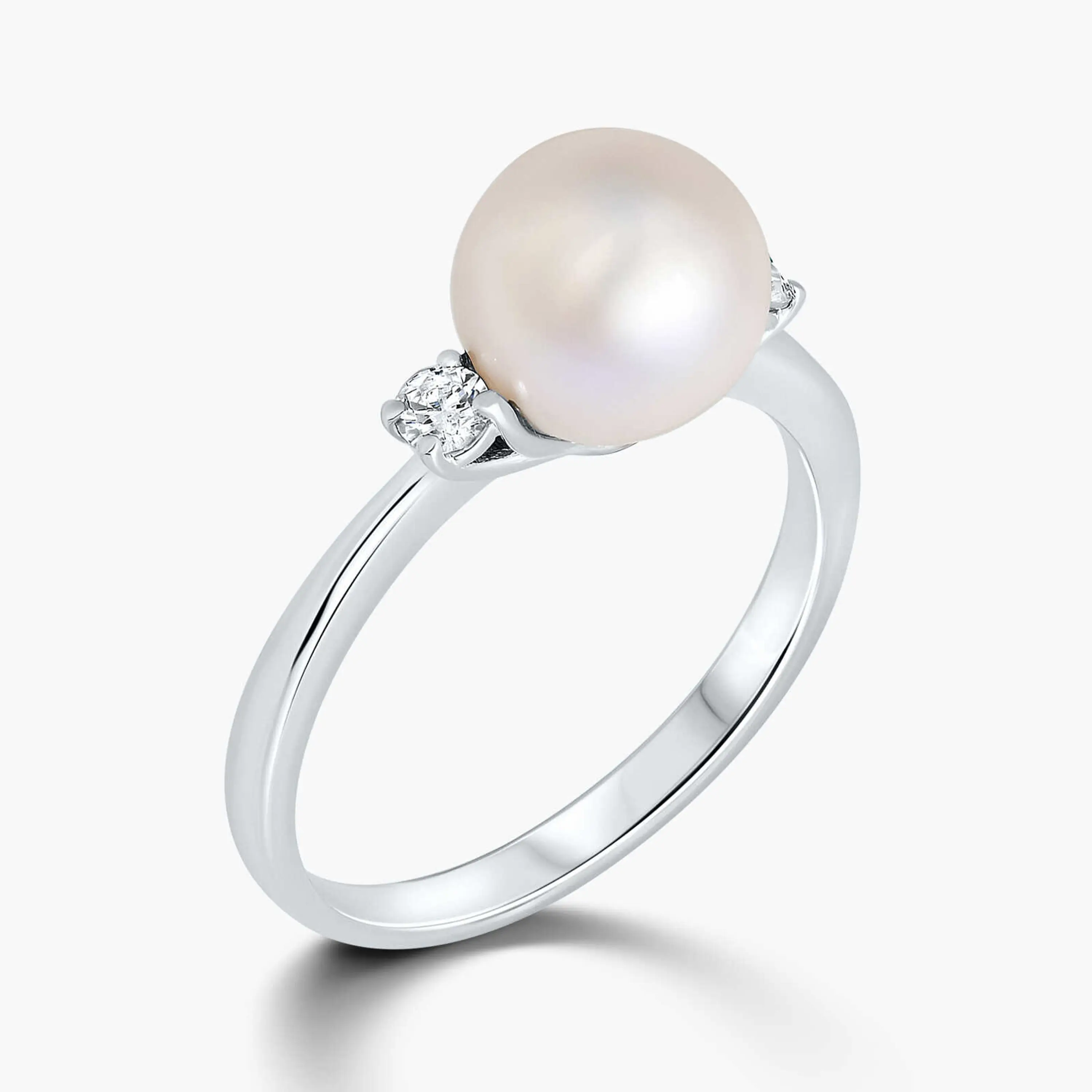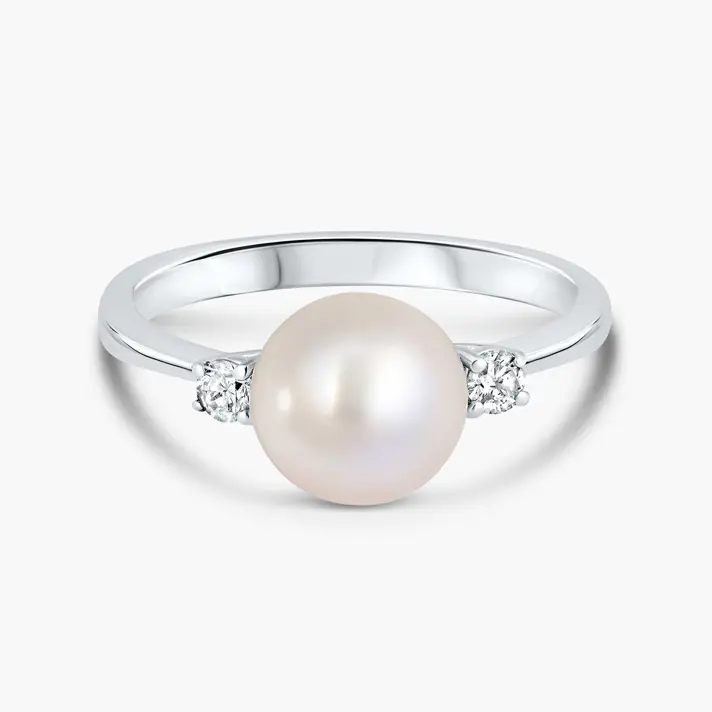 טבעת זהב 14K בשיבוץ פנינת מים מתוקים עגולה בקוטר 9 מ"מ ו 2 יהלומים טבעיים ונוצצים