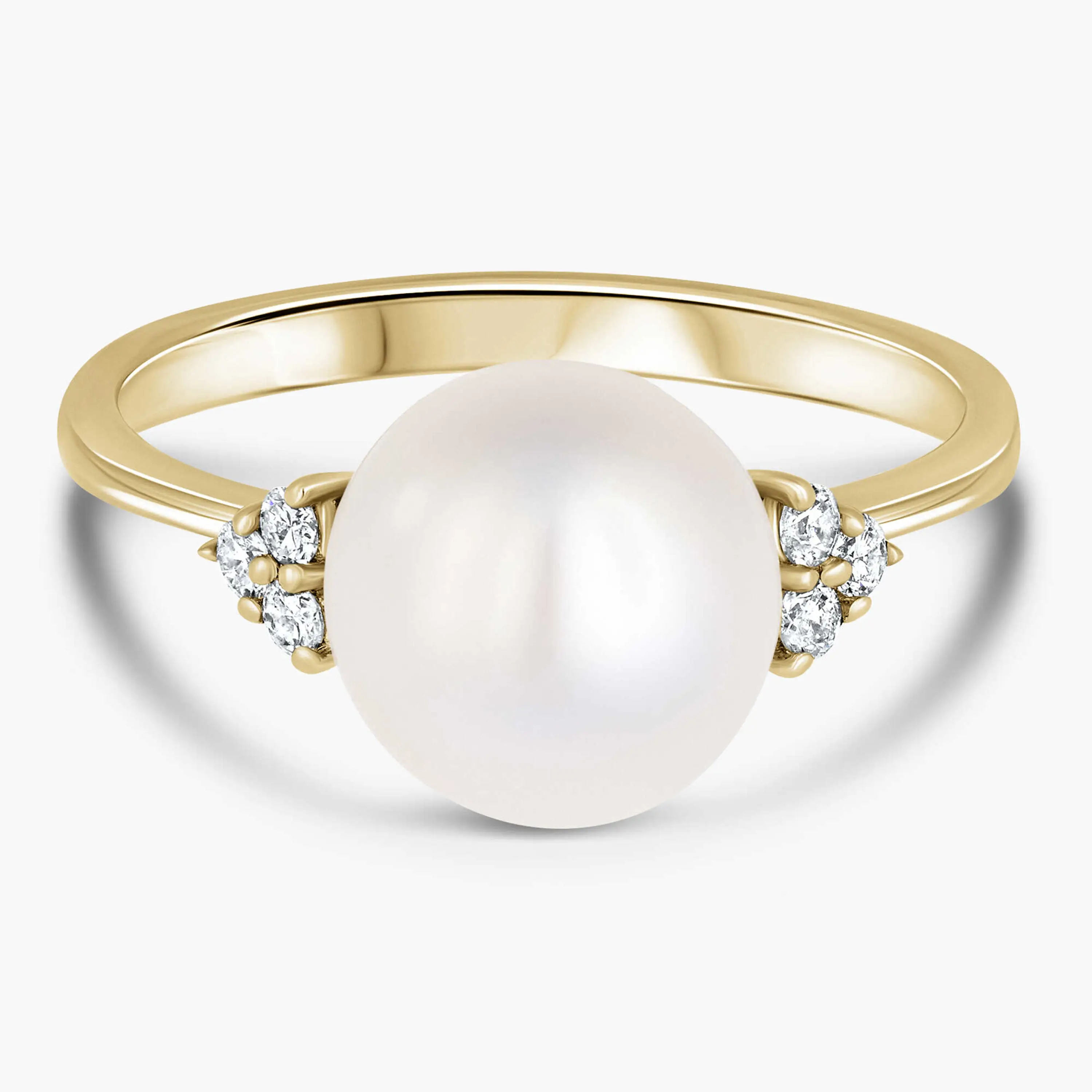 טבעת זהב 14K בשיבוץ פנינת מים מתוקים עגולה בקוטר 9 מ"מ ו6 יהלומים טבעיים ונוצצים- 3 מכל צד.