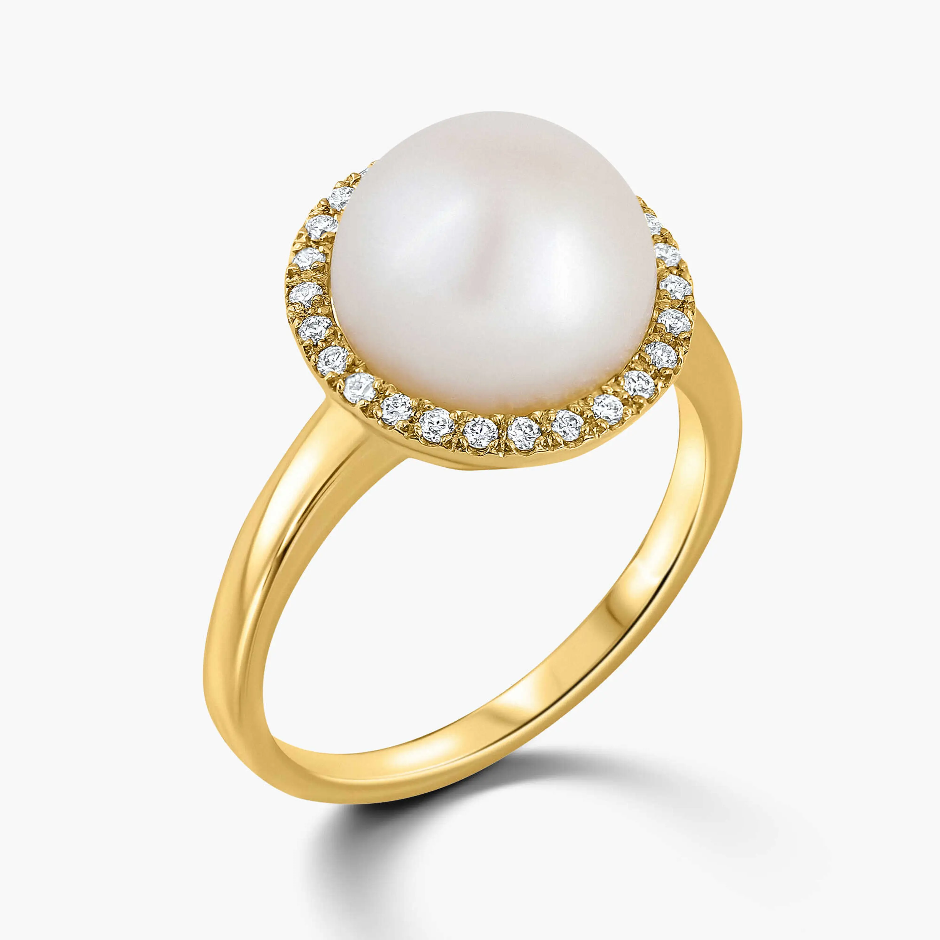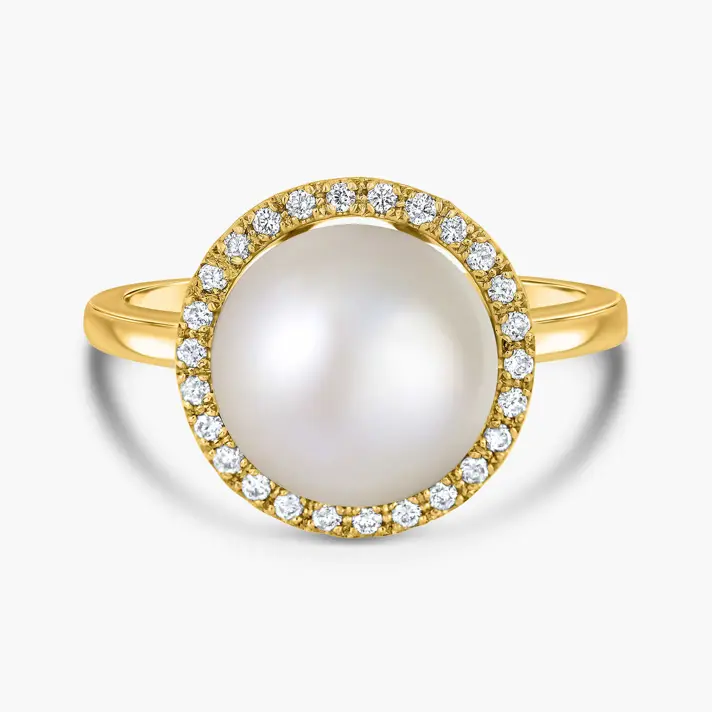טבעת זהב 14K בשיבוץ פנינת מים מתוקים בקוטר 10 מ"מ וסביבה 26 יהלומים טבעיים ונוצצים.