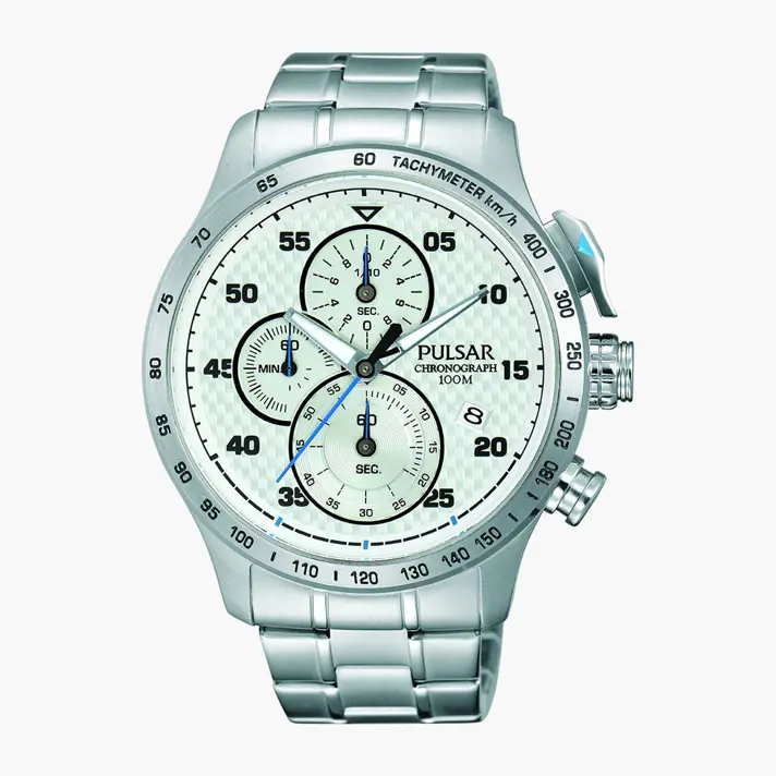 שעון PULSAR מבית SEIKO יפן. בעל לוח לבן מהפנט, כרונוגרף, תאריכון, צמיד מתכת איכותי ועמידות למים ל 100 מטר.