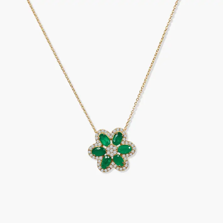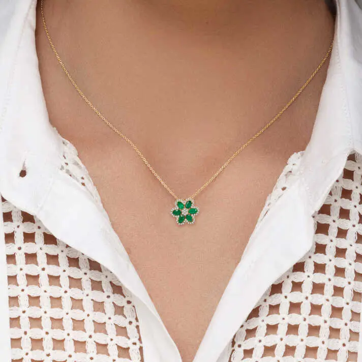 תליון פרח מזהב 14K משובץ 55 יהלומים ו 6 אבני אמרלד.