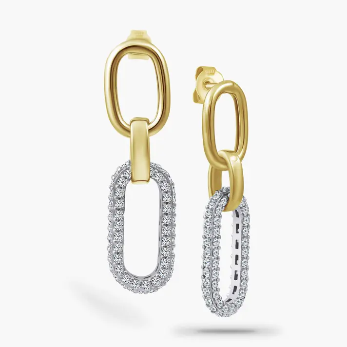 עגילי זהב 14K תלויים בשילוב חוליות משובצת זרקונים נוצצים. אורך העגילים 3.2 ס"מ
