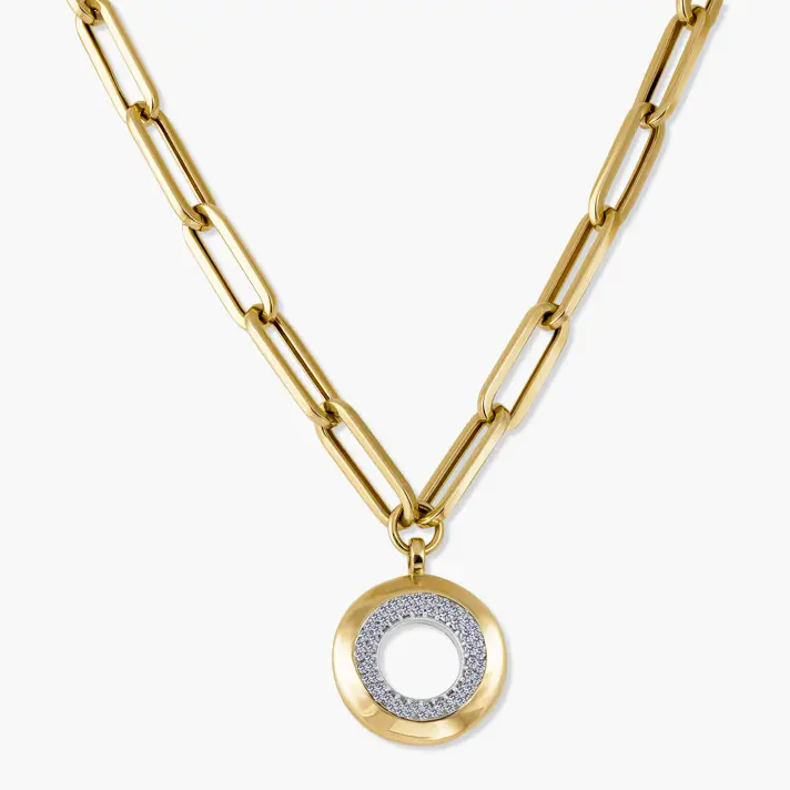 שרשרת זהב 14K עם חוליות מלבניות ותליון עגול בקוטר 1.5 ס"מ , משובץ זרקונים נוצצים. אורך השרשרת 50 ס"מ.