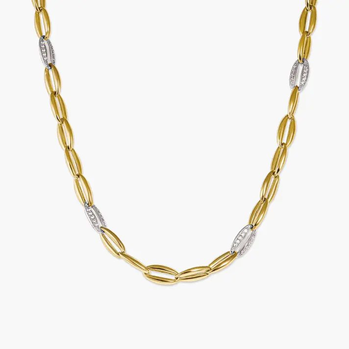 שרשרת זהב 14K בשילובי חוליות מעוגלות, עם 5 חוליות משובצות זרקונים נוצצים. מידות החוליות חוליות 4.5*9 מ"מ, מידות השרשרת 44 ס"מ.