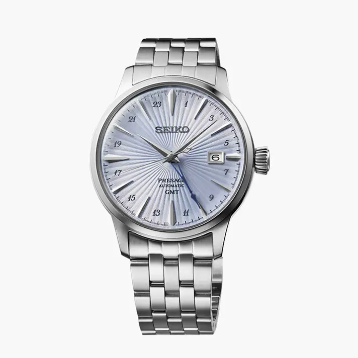 שעוני ה-שעת הקוקטייל Cocktail Time של Presage מעוצבים בהשראת תרבות הקוקטיילים היפנית ומשקאות ספציפיים מבר הכוכבים Star Bar ברובע גינזה היוקרתי בטוקיו. הקוקטייל Skydiving מאזן בצורה מושלמת טעמים מתוקים וחמוצים עם תערובת של רום, מיץ ליים וליק�ר קורסאו כחול, שמעניק לו גוון תכלת בהיר. לוח השעון התכלת בהיר של שעון ה- Skydiving עם השתקפויות קרני השמש נועד לדמות את המראה דרך כוס קוקטייל. מחוג ה-GMT בהשראת גבעול כוס קוקטייל, בעוד שמחוג השניות מסמל מקל ערבוב קוקטיילים עם הידית האלגנטית שלו. בשילוב עם הספרות הערביות, שעון זה עוקב אחר שני אזורי זמן בו זמנית. שעון זה כולל תצוגת תאריך בשעה 3, לנוחות נוספת. הוא מגיע עם צמיד חוליות חמש, לשבירת אור נוספת ונוחות. השעון מופעל באמצעות מנגנון 4R34 GMT שמיוצר ב SEIKO, עם עתודת כוח של 41 שעות. לשעון זכוכית הרדלקס למניעת שריטות ועמידות במים עד 50 מ' עומק. קוטר השעון 40.5 מ"מ.