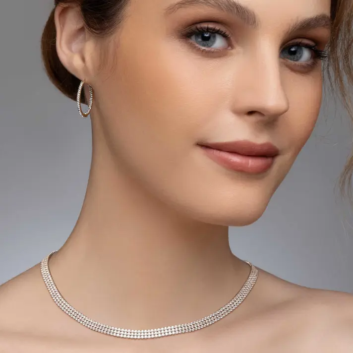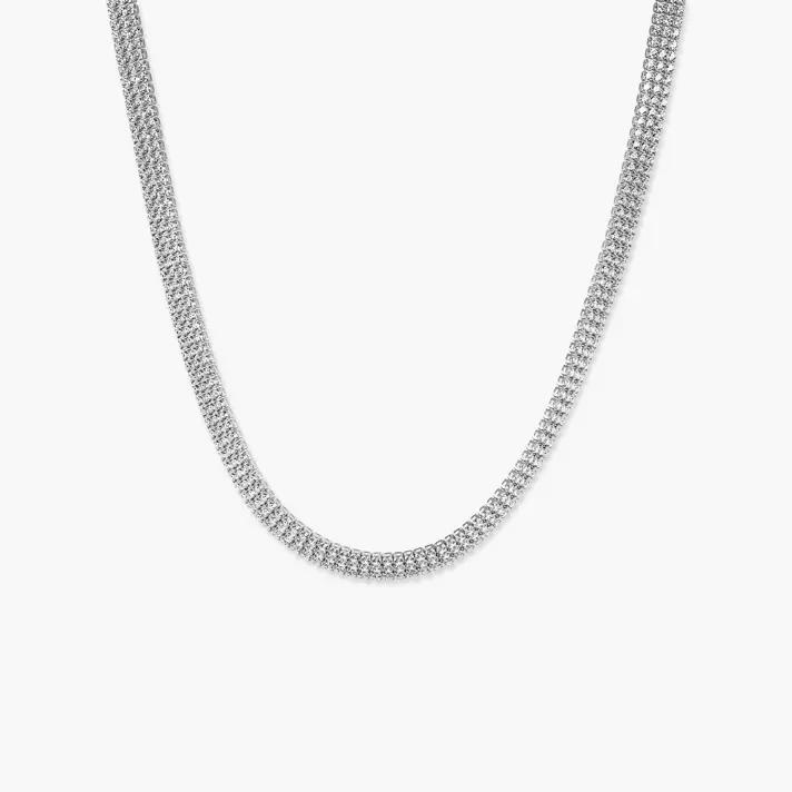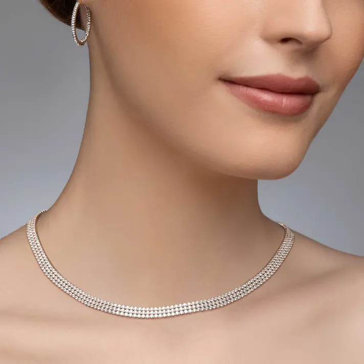 שרשרת צ'וקר טניס מזהב 14K בשיבוץ שלוש שורות של זרקונים נוצצים. אורך השרשרת 38 ס"מ.