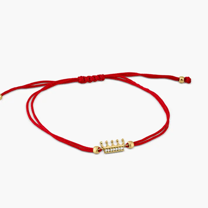 צמיד מקולקציית ה LUCKY CHARM עשוי חוט אדום, המסמל הגנה, מזל טוב ואהבה בשילוב צ'ארם כתר מזהב 14K בשיבוץ זרקונים נוצצים.