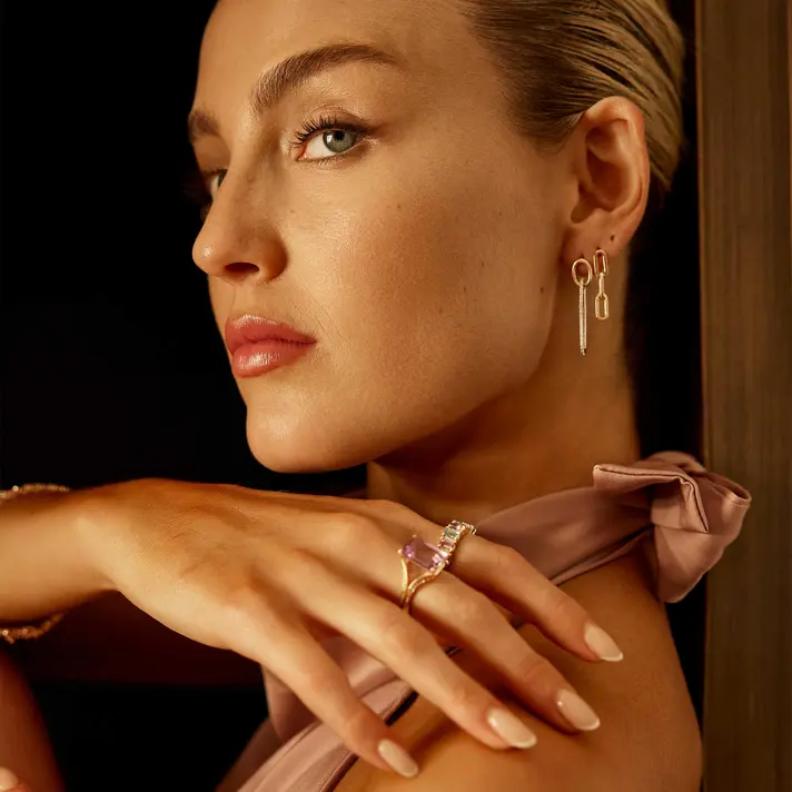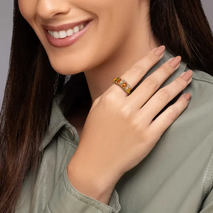 טבעת מקולקציית ה RAINBOW מזהב 14K בשיבוץ 7 ספירים בחיתוך טיפה ו 12 יהלומים טבעיים ונוצצים
