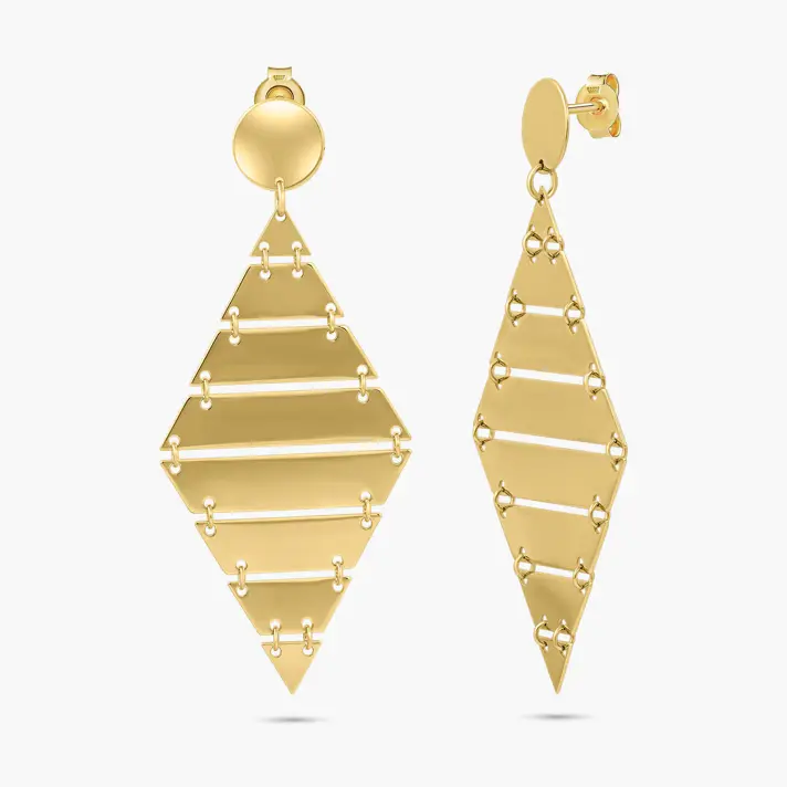 עגילי זהב 14K במראה מעויין המורכב מפלטות מלבניות המתחברות זו לזו, למראה מלא תנועה. מידות העגילים 5.0*2.0 ס"מ.