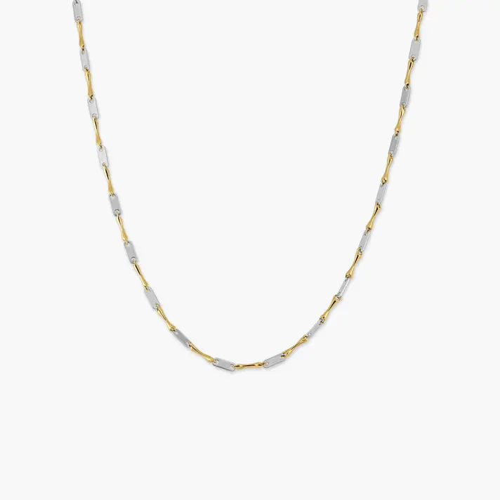 שרשרת זהב 14K בשילוב שתי סוגי חוליות- חוליית דיסקית מחוררת בזהב לבן וחוליה מוארכת בזהב צהוב. מידות השרשרת 50 ס"מ.