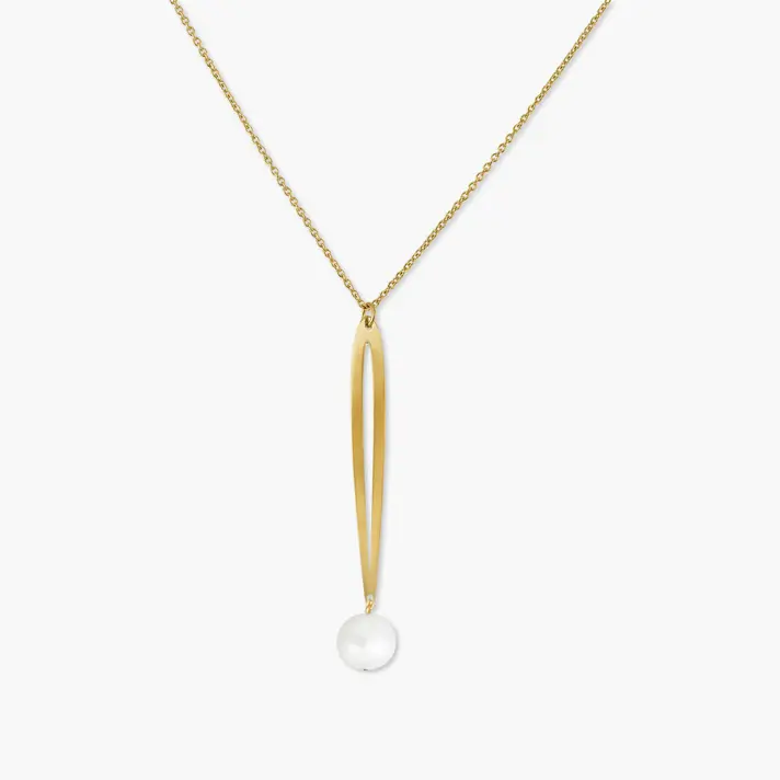 שרשרת טיפת טל מזהב 14K בשילוב תליון טיפה עם סיומת פנינה בקוטר 6 מ"מ. אורך התליון 4 ס"מ, אורך השרשרת 42 ס"מ + 2.5 ס"מ הארכה נוספים.