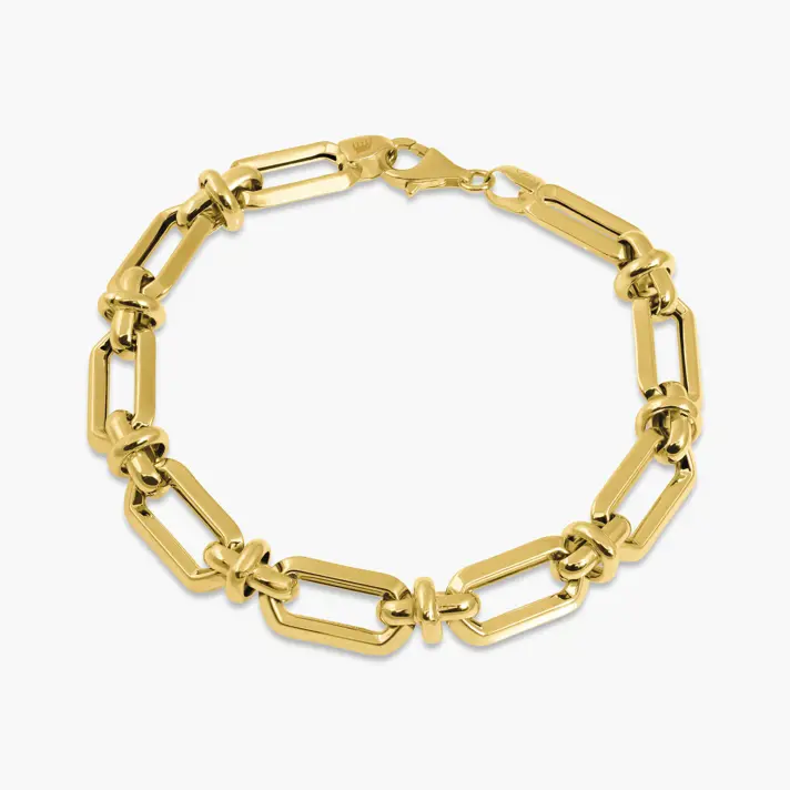 צמיד זהב 14K במראה חוליות עכשווי ומלא נוכחות בשילוב חוליות במספר גדלים ובחיבור שתי וערב ביניהן. מידות החוליות הגדולות 1.6*0.8 ס"מ. אורך הצמיד 18.5 ס"מ.