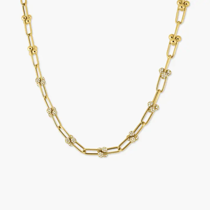 שרשרת מירן מזהב 14K עשויה חוליות מלבניות בסיומת כדור זהב ובשיבוץ חלקם בזרקונים נוצצים. אורך השרשרת 45 ס"מ.