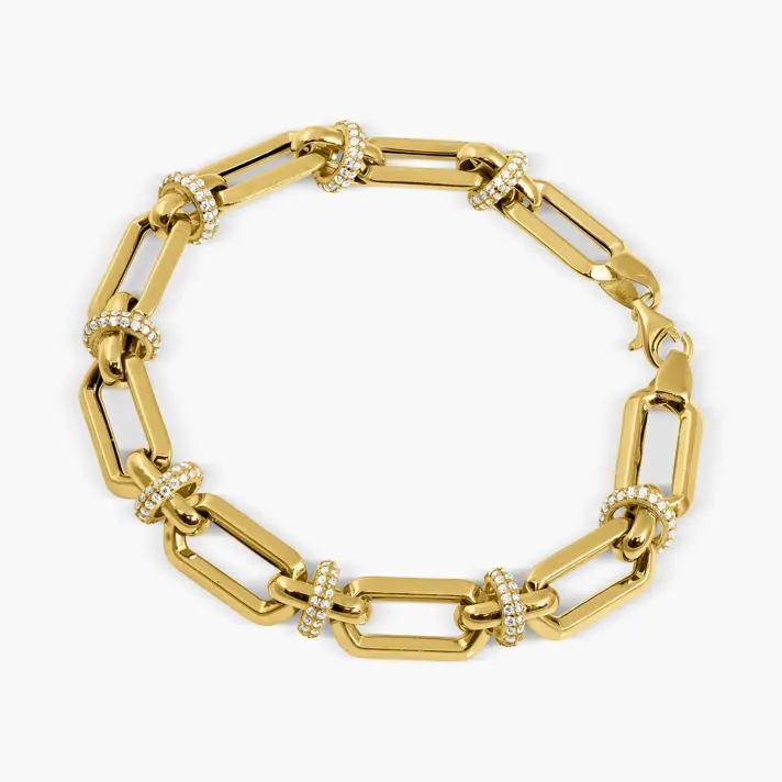 צמיד זהב 14K במראה חוליות עכשווי ומלא נוכחות בשילוב חוליות במספר גדלים ובחיבור שתי וערב ביניהן בשיבוץ זרקונים נוצצים. אורך הצמיד 19 ס"מ.
