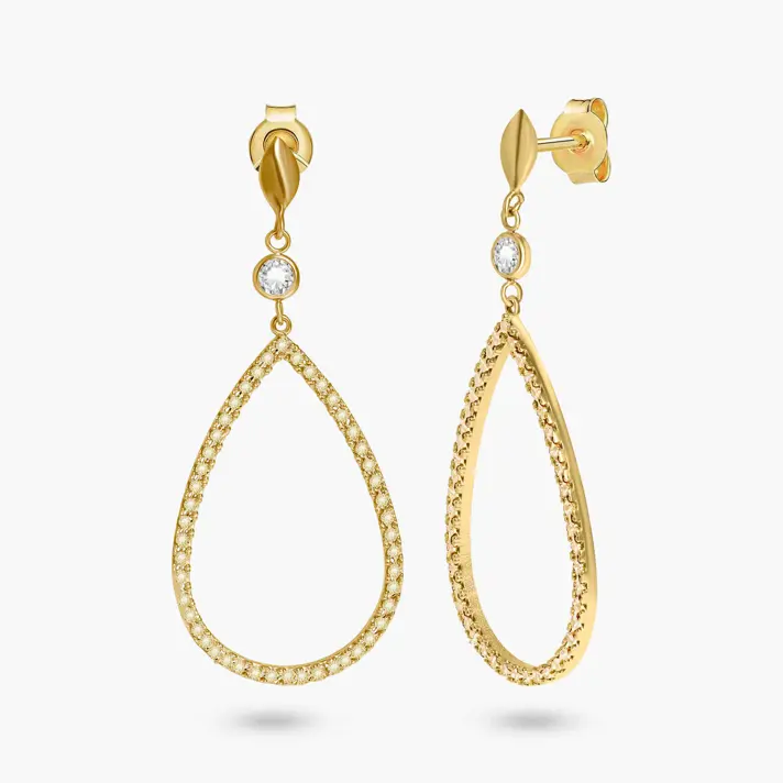 עגילי זהב 14K בצורת טיפה ובשיבוץ זרקונים נוצצים. מידות העגילים 5.5*3.2 ס"מ