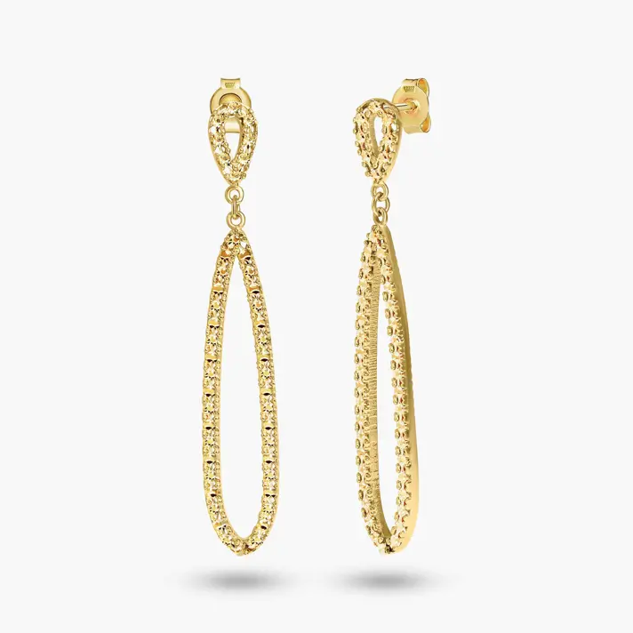 עגילי זהב 14K בצורת טיפה המחזיקה טיפה ארוכה יותר עם גימור מרוקע לאקסטרא נצנוץ. מידות העגילים 5.0*0.8 ס"מ/