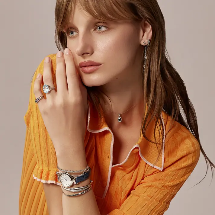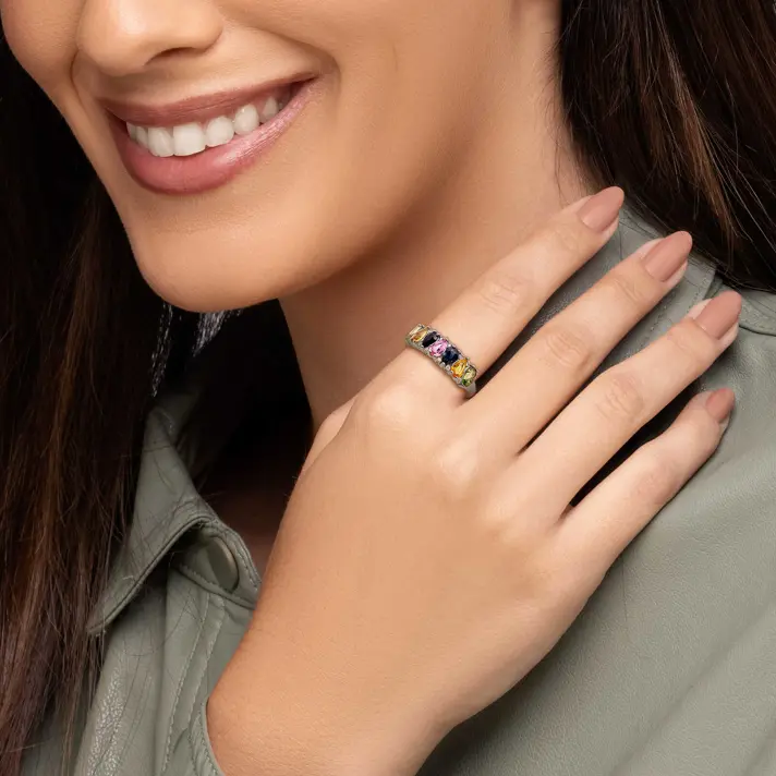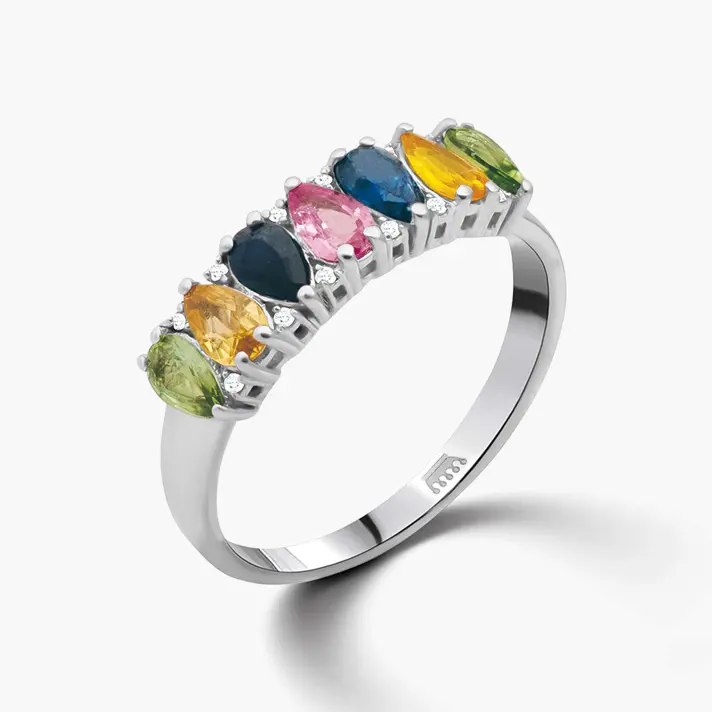 טבעת מקולקציית ה RAINBOW מזהב 14K בשיבוץ 7 ספירים בחיתוך טיפה ו- 12 יהלומים טבעיים ונוצצים.