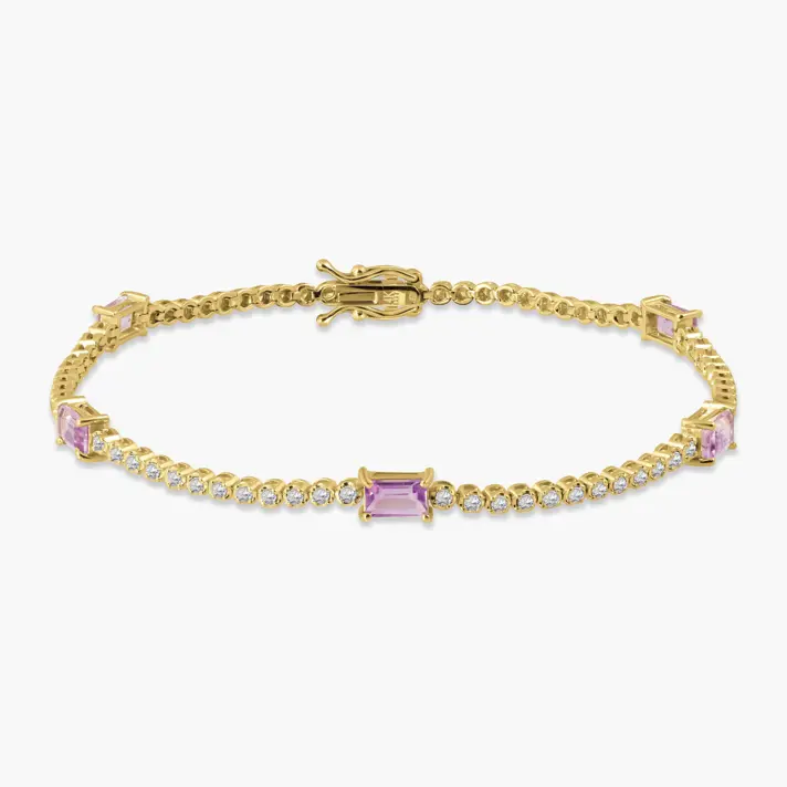 צמיד זהב 14K מסדרת ה - Double Shine בעלת זוהר כפול של אבני חן ויהלומים. בצמיד משובצים 72 יהלומים טבעיים ונוצצים ו- 5 אבני חן מסוג פינק אמטיסט בחיתוך באגט יוקרתי.