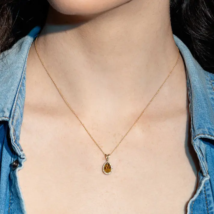 תליון טיפה מזהב 14K בשילוב אבן חן מרכזית מסוג סמוקי קוורץ בגוון חום ו 25 יהלומים טבעיים ונוצצים מסביבה.
