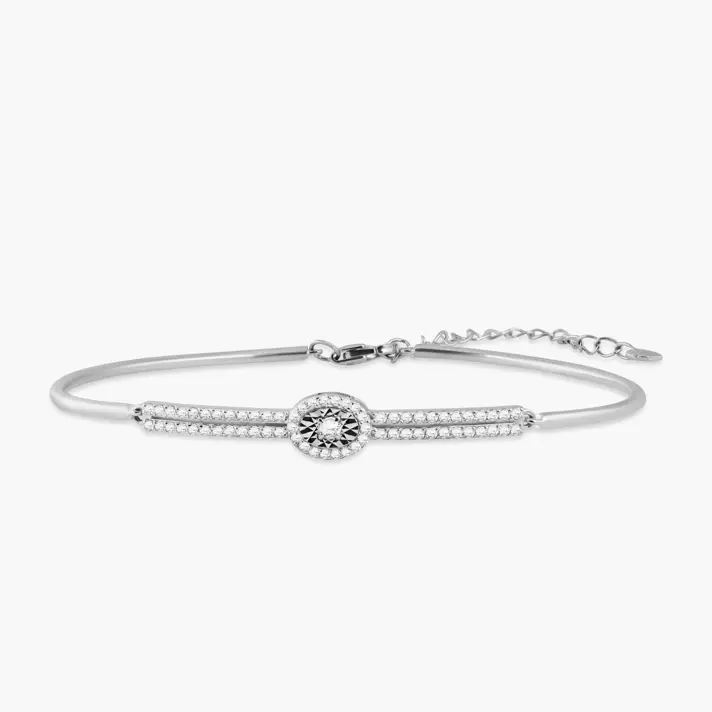 צמיד זהב 14K חצי קשיח, עשוי פלטת זהב משובצת 66 יהלומים טבעיים ונוצצים ויהלום מרכזי בחיתוך לייזר מנצנץ לאקסטרא נצנוץ.