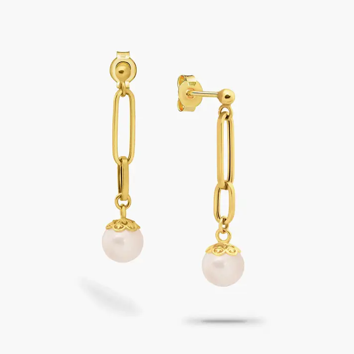 עגילי זהב 14K במראה חוליות עדכני עם סיומת של פנינה בקוטר 8 מ"מ. אורך העגילים 3.6 ס"מ.