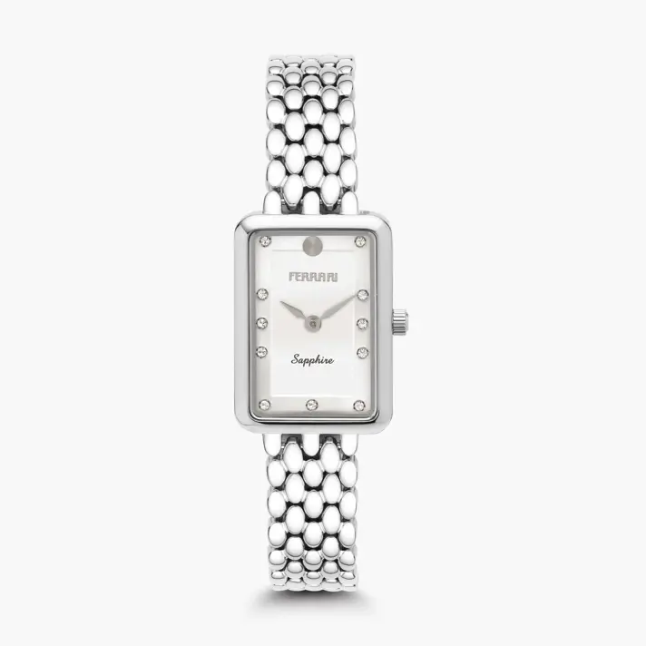 שעון FERRARI נשים מלבני עם מנגנון קוורץ, לוח לבן עם מסגרת פנימית כסופה תלת מימדית להוספת עומק ושיבוץ זרקונים נוצצים . גוף השעון והצמיד עשויים פלדת אל חלד איכותית בגוון כסוף. לשעון זכוכית ספיר קריסטל למניעת שריטות ועמידות לשטיפת ידיים בלבד. מידות 20*33.6 מ"מ.