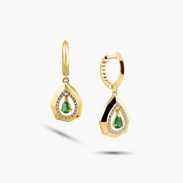 עגילי זהב בצורת טיפה בשיבוץ יהלומים ואמרלד