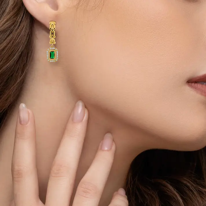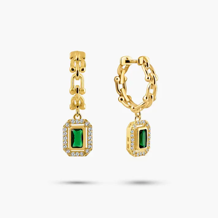 עגילי זהב 14K במראה חוליות הכי טרנדי ומדובר עם תליון מלבני משובץ 40 יהלומים וגרין גרנט. אורך העגילים 2.6 ס"מ.